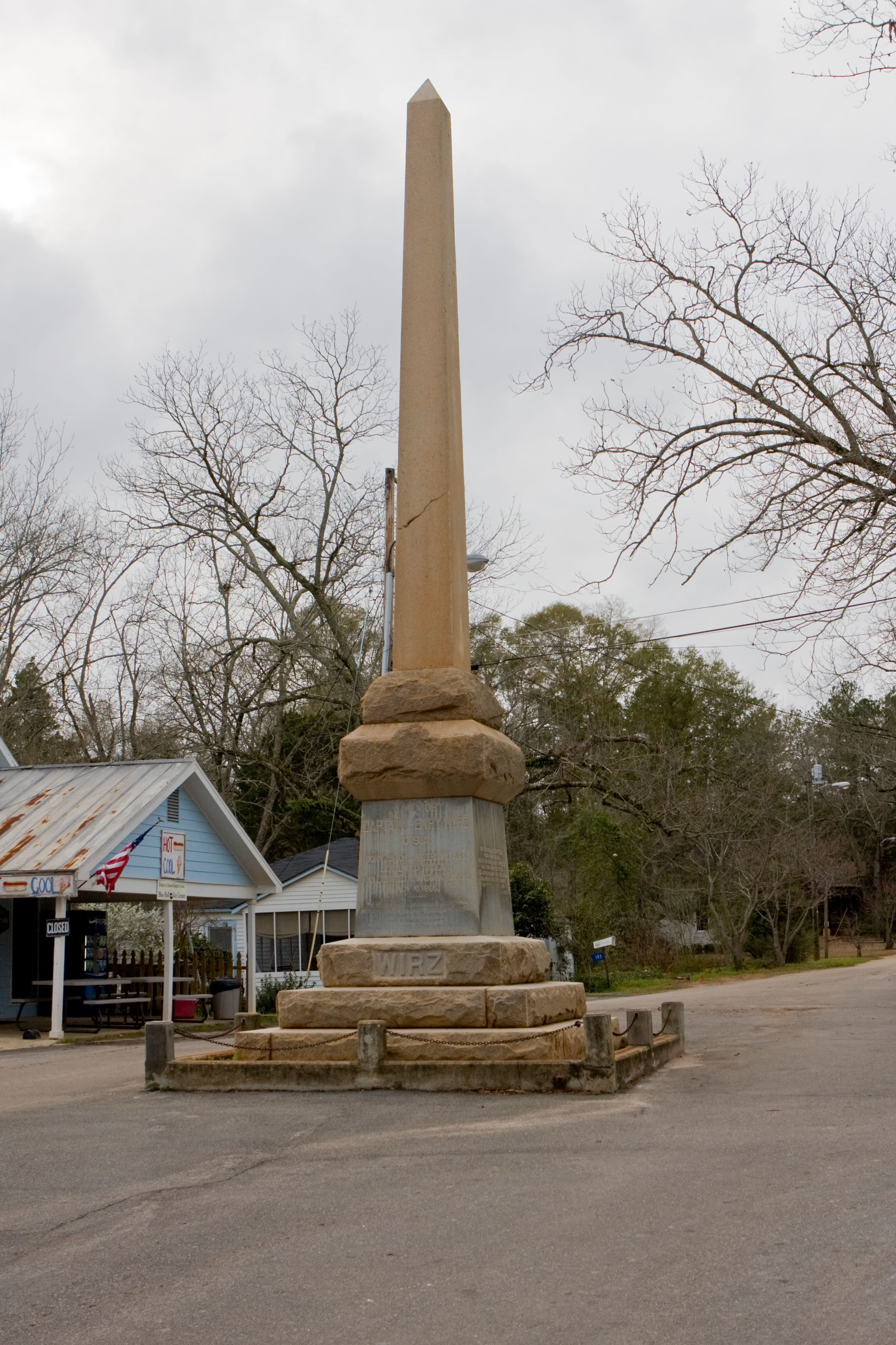 A 24-foot monument to Confederate Captain Henry Wirz stands barely a mile from Camp Sumter.